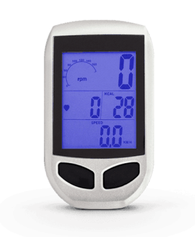 Показания консоли: часы (12/24часа), скорость, сравнение скорости стрелками вверх/вниз (AVG_SPD), время тренировки, ЧСС, вверх/вниз стрелка отразит верхний/нижний предел, среднее значение пульса, килокалории, 5K передатчик w/ремень, задание времени тренировок, целевые зоны пульса, задание персональных данных.