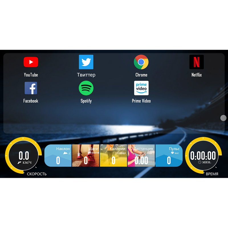 Высокотехнологичная консоль с большим цветным TFT дисплеем 10”. Все параметры, схемы и графики тренировки отображаются в удобном формате, для восприятия «в движении». Программный пакет включает виртуальный ландшафт и режимы соревнования, в общей сложности более 40 программ: пульсозависимые, персональные, интервальные, на выносливость, BodyFat и пр. TFT консоль подключается к сети Internet, доступны к просмотру: YouTube, Spotify, Twitter, Facebook, поиск в браузере, оснащена USB reading port для воспроизведения видео и аудио файлов.