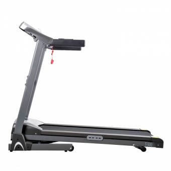 Электрическая беговая дорожка с механической регулировкой угла наклона полотна. Складная конструкция. Встроенные колеса для перемещения. Большой LCD дисплей. По краям от экрана отображается информация о выбранной программе. Два удобных кармана для бутылки с водой и различных предметов по краям от панели управления. Держатель для электронного устройства на панели управления.