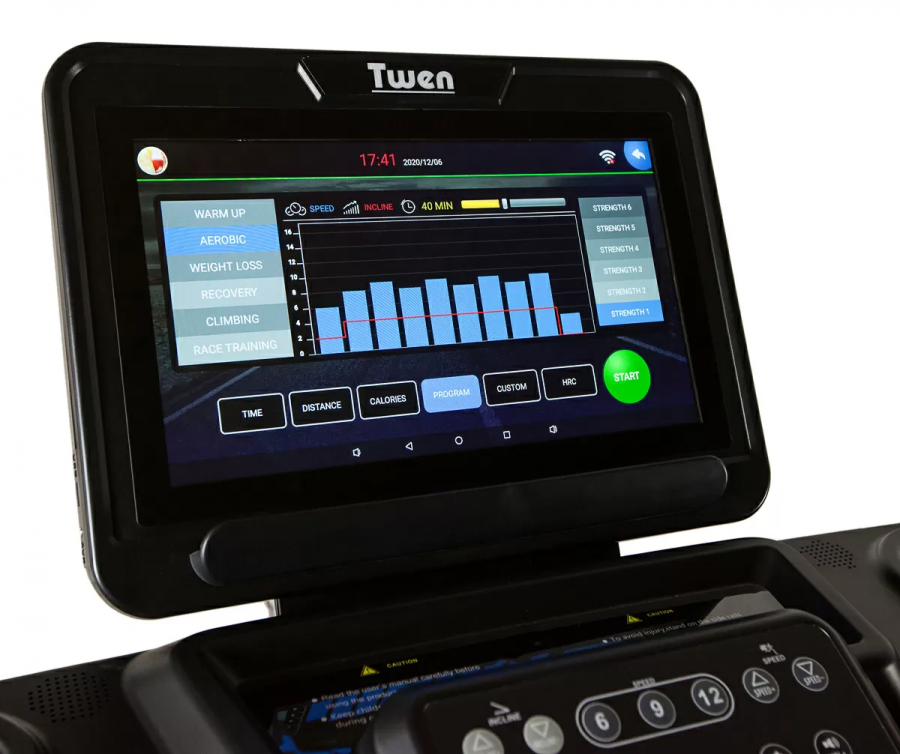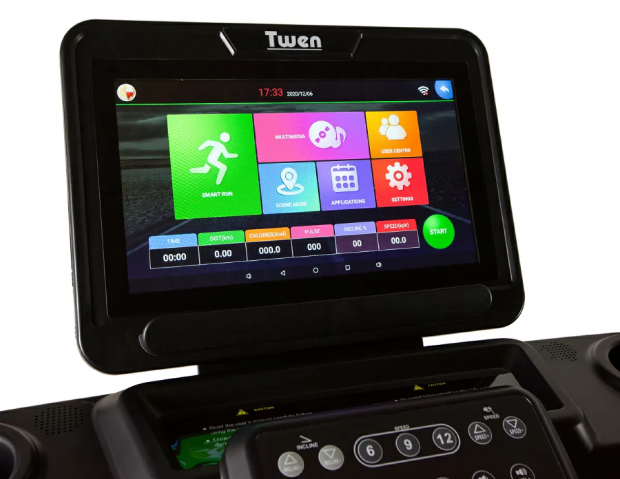 Модель оснащена большим сенсорным экраном (емкостный экран, как в смартфонах). Устройство имеет возможность устанавливать различные программы тренировок, благодаря которым можно свободно корректировать тренировку в соответствии с ожиданиями. Чтобы разнообразить тренировки, вы можете выбрать вариант бега на стадионе или в у моря. На экране выберете подходящую местность, затем на дисплее появится симуляция бега на заданном участке. Будет создаваться впечатление, что вы тренируетесь, например, в лесу. На экране есть приемник Wi-Fi и система Android, поэтому его можно использовать как планшет. Разъем USB и возможность подключения MP3 позволяет наслаждаться любимой музыкой или фильмами.