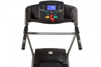 Панель управления оснащена 5-дюймовым LCD дисплеем, отображающим основные параметры тренировки: дистанцию, время, скорость, угол подъема, расход калорий, пульс. Кроме этого, на панели расположены клавиши «быстрого регулирования» для изменения скорости движения бегового полотна, а также "старт"-"стоп". Функция подключения MP3 и мощная акустическая система – еще один плюс этой беговой дорожки, выгодно отличающий ее от конкурентов.