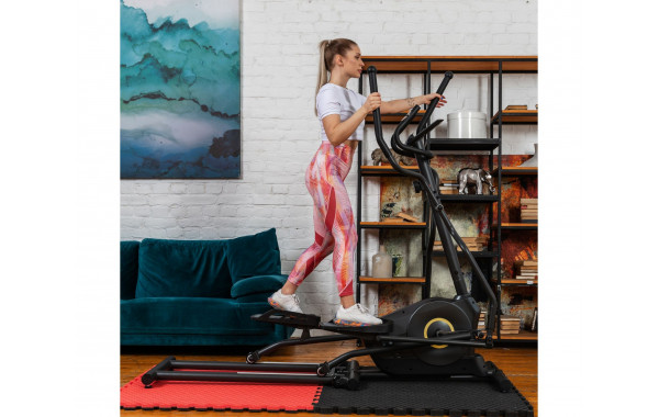 В этой модели эллиптического тренажёра есть всё для комфортных и результативных тренировок. На передней консоли можно удобно разместить планшет. Там же расположен дисплей, где отображаются основные параметры тренировки: скорость, дистанция, количество потраченных калорий, уровень пульса. Пульс считывается при помощи датчиков, расположенных на поручнях.