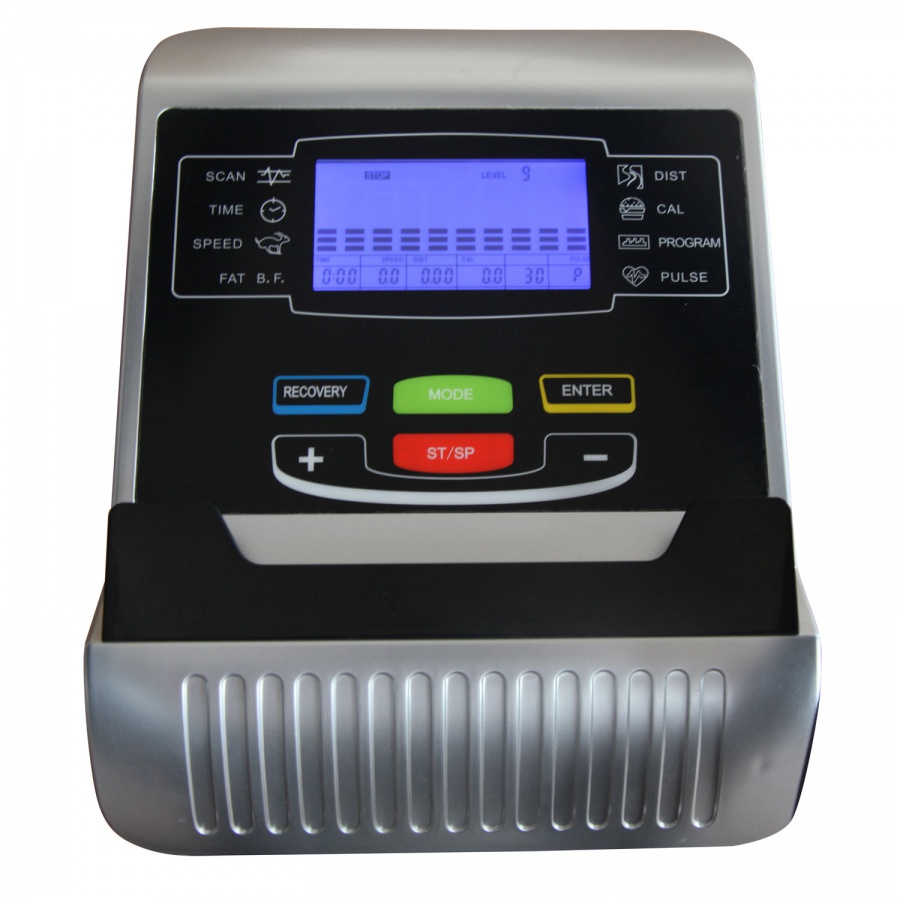 Показания консоли  скан, время, скорость, расстояние, калории, пульс, ватт, жироанализатор (BodyFat), восстановление пульса (Recovery)