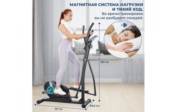Тренажёр имеет максимальный вес пользователя 130 кг и длину шага 38 см. Механическая регулировка нагрузки предлагает 8 уровней сложности, а транспортировочные ролики и компенсаторы неровности пола обеспечивают стабильность и удобство использования.