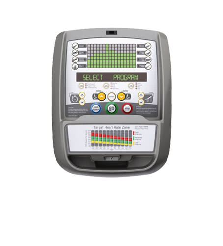 Показания консоли  профиль, время, дистанция, скорость, обороты в мин., уровни, наклон, калории, пульс, метаболические ед-цы, Ватты
