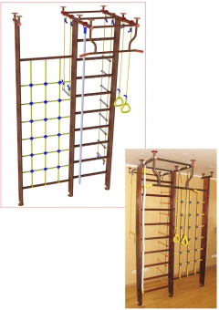Детский спортивный комплекс "Д-6" предназначен для выполнения различных общеразвивающих упражнений, способствующих более полному развитию детей в возрасте от 3,5 лет. Спортивный комплекс представляет собой комбинированную (металл-дерево) конструкцию, закрепленную между полом и потолком в распор. Детский спортивный комплекс "Вереск "Д-6" с сеткой" выполнен из массива берёзы/сосны. Абсолютно экологичный материал - дерево, обязательно порадует малыша тёплыми ощущениями. Поручни стенки не холодят руки, комфортны для захватывания. Сетка собирается как вправо, так и влево, поэтому вы можете моделировать расположение комплекса так, как вам это необходимо.
