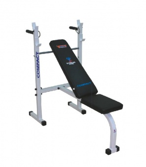 Универсальная скамейка начального уровня предназначена для тренировок со штангой в условиях комнаты (квартиры и т.п.). Спинка регулируется в четырех положениях от 0° до 60°, путем смены положения опорной перемычки. Сидение регулируется в двух положениях. Стойки оснащены верхними основными ловушками с замками против сваливания грифа и дополнительными страховочными ловушками. На стойках установлены ручки для отжимания на брусьях. Допустимо применять штангу тренировочную длиной 160-180 см. Основа спинки и сидения - многослойная фанера (1,5 см), в качестве наполнителя используется поролон, устойчивый к усадке, покрытый высококачественной искусственной кожей различных цветов.