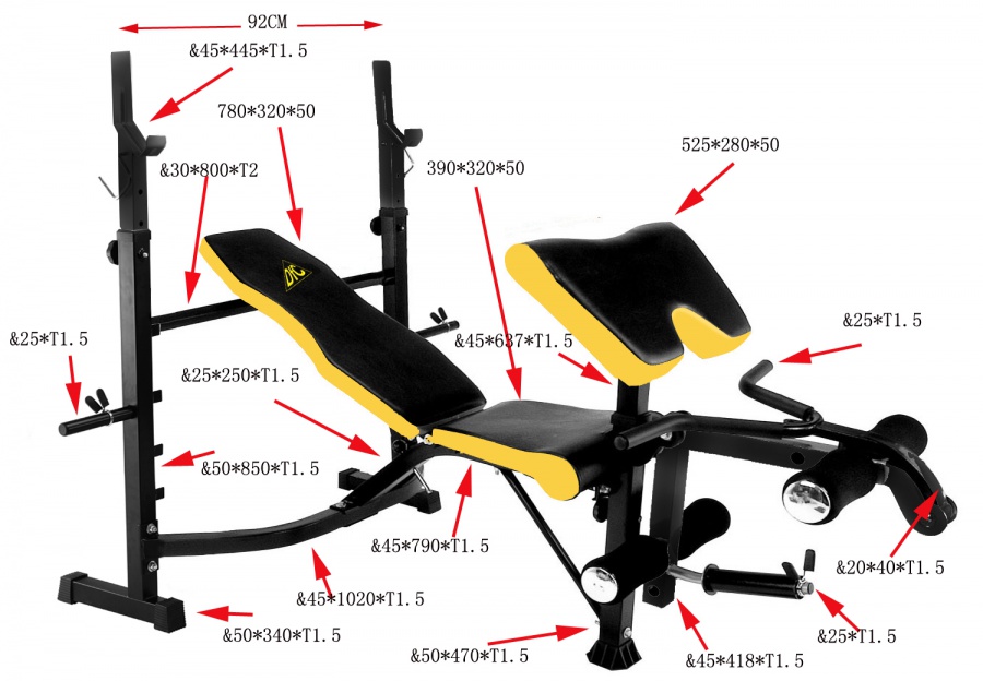 Силовая многофункциональная скамья под штангу DFC D7828. Стойки под штангу с замками безопасности. Жим лёжа, сгибание и разгибание ног в коленном суставе, парта для бицепсов. Рычаги блока для ног снабжены мягкими валиками. Штанга и диски в комплект не входят. В качестве нагрузки используются диски диаметром 26 мм.