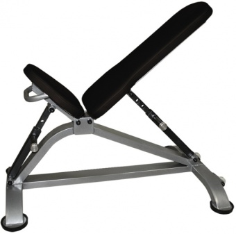 Имеет широкий предел регулировки углов наклона спинок: большая спинка регулируется в пределах от 0 град. (горизонтальное положение) до 80 град (практически вертикально). Имеет семь ступеней регулировки. Малая часть (сиденье) регулируется от горизонтального положения до 45 град, три положения. Скамья предназначена для выполнения упражнений с гантелями, а также совместно со станком Смита, различными стойками и приспособлениями. Опорные части тренажера оснащены резиновыми подпятниками диаметром 120 мм, толщина резины 20 мм, что обеспечивает отличное сцепление с поверхностью пола и гашение вибрации. Дополнительно ножки тренажера имеют отверстия для крепления к полу, во избежание его перемещения посетителями зала.