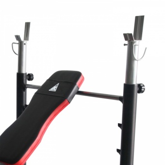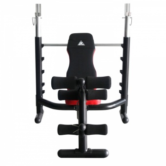 • Силовая скамья со стойками под штангу. Дополнительно установлена опция жим ногами.