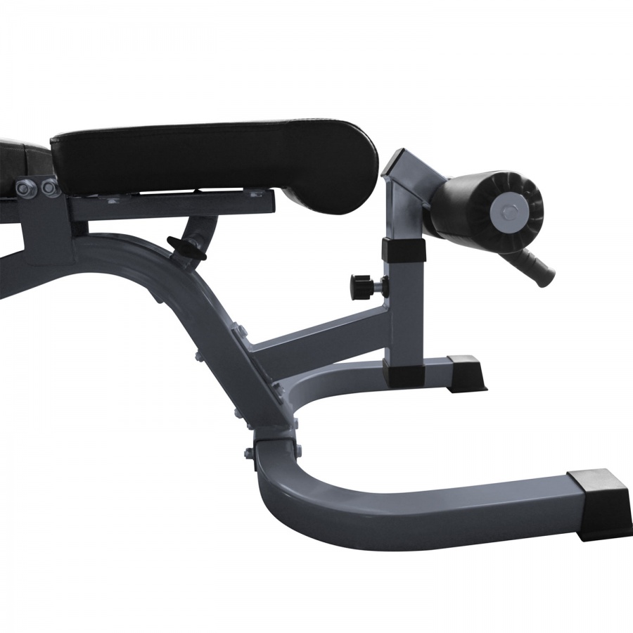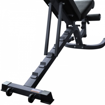 Сиденье скамьи регулируется по углу наклона в широком диапазоне. Фиксация в нужном положении с помощью упора с обратной стороны скамьи. 6 положений. Сиденье и валики для ног так же регулируются.