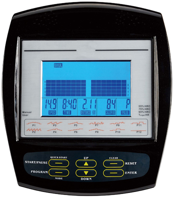 Показания дисплея  время, дистанция, обороты в минуту, скорость, уровень, калории, ЧСС и нагрузка