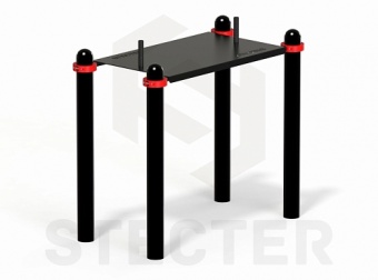 Стол состоит из четырех опорных столбов и металлической столешницы с рукоятками. Края Столешницы подогнуты для обеспечения травмобезопасности. Крепление металлического столба производится стандартными хомутами «Воркаут». Высота столбов 1200мм.