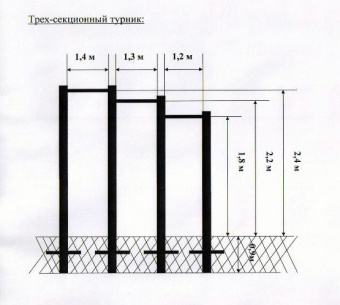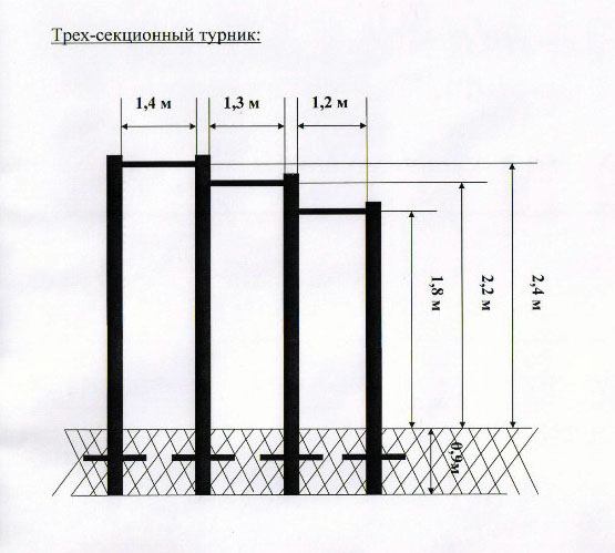 • Изготавливается из профильной трубы 40х60мм или 60х60 мм , перекладины диаметром 27мм, высоты турника (от уровня земли) 2.4м, 2.2м, 1.8м, длины перекладин соответственно: 1.2м, 1.1м, 1.0м, заглубление в землю 90-100 см. Изготавливается на заказ.