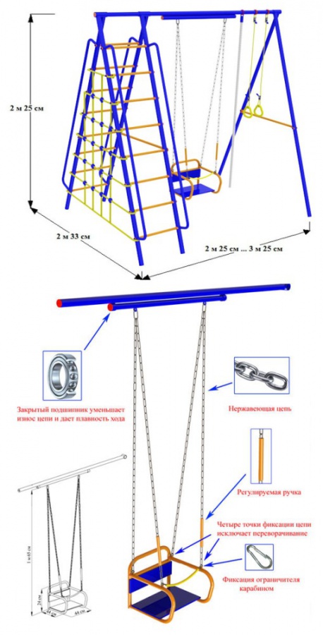 Дачный спортивный комплекс "Вертикаль" А1+П, с поручнями, с канатной сеткой, c качелями на цепях