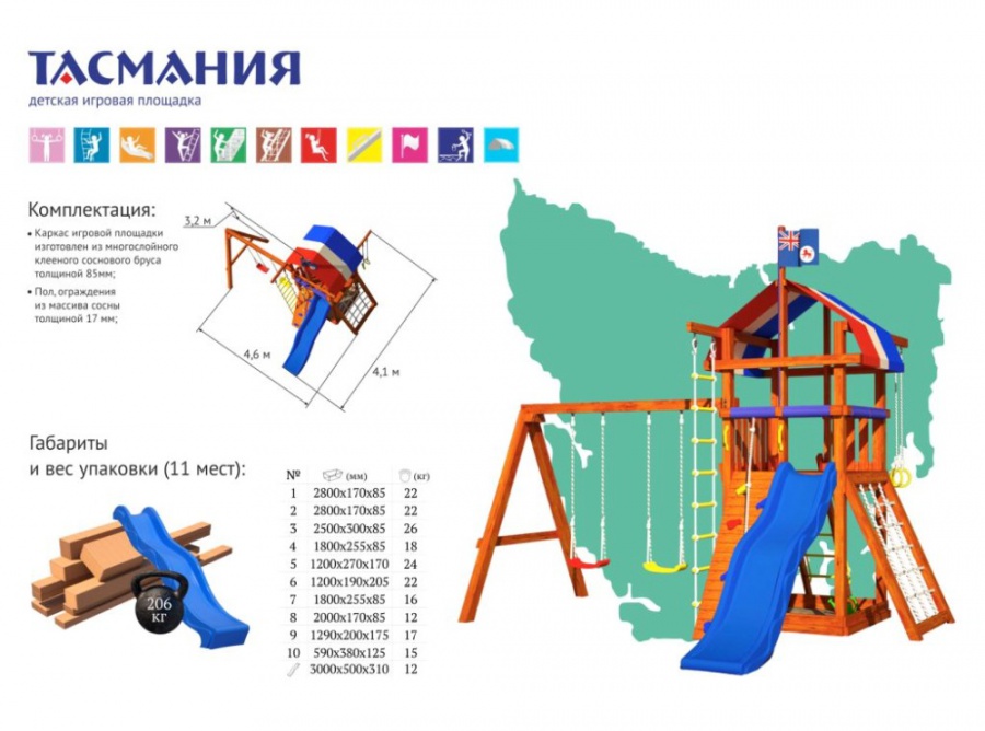 Детская деревянная площадка "Тасмания" упакована в гофрокартонные короба: 10мест + горка.