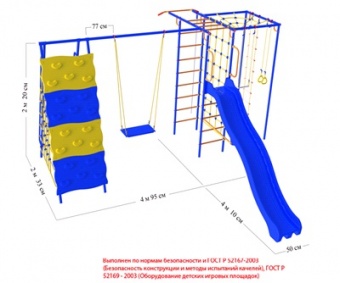 Детский спортивный комплекс "Веселый Непоседа" Модель "Радуга "ПЛЮС" предназначен для выполнения различных спортивных упражнений способствующих более полному физическому развитию детей в возрасте от 3,5 лет. Комплекс используется на лужайке. Бетонированные или выложенные плиткой поверхности исключаются. Этот комплекс предназначен для использования на дачном участке и не должен использоваться в общественных местах, таких как: парки, общественные игровые площадки, дворы и т. д. Установка комплекса производится с обязательным бетонированием опорных стоек в земле на глубину примерно 20-25 см (или на высоту/ширину штыка лопаты). Основа - трубная металлическая сборно-разборная конструкция. Покрытие - атмосферостойкая всепогодная порошковая краска.