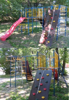 Дачный комплекс "Городок" № 14 - детский спорткомплекс с литой пластиковой горкой, двумя скалодромами и множеством снарядов. Настоящий детский городок на свежем воздухе!