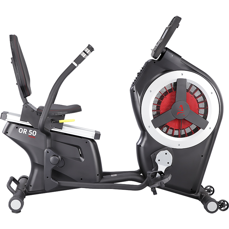 Мощная и эргономичная конструкция тренажера на литой раме обеспечивает комфорт тренировок пользователям до 180 кг. в диапазоне допустимого роста от 1,6 до 2 м., фиксируя правильную посадку спортсмена. Цельная тяжелая рама — это надежность, устойчивость и безопасность. Дополнительная система вентиляции от аэромаховика создает естественный плотный бриз. Регулируемый люк в корпусе тренажера позволяет направить поток воздуха на спортсмена, изменять направление и мощность потока, а при необходимости отключить вентиляцию. Правильная биомеханика и удобная посадка создают возможность продолжительных и интенсивных тренировок с высокой эффективностью без дискомфорта и болевых ощущений, направляя усиленную нагрузку на мышцы ног и ягодиц, плечевой пояс, косые мышцы живота и мышцы спины. Исполнение педально-рычажного механизма создает идеальную нагрузку практически для всех групп мышц. Активные поручни специально разработаны для пользователей разного телосложения. Удобное анатомическое кресло с регулируемой спинкой сиденья установлена на алюминиевый трек, который легко позволяет менять его положение. Педали с регулируемыми ремнями и автобалансировкой настраиваются практически под любой размер стопы и обеспечивают безопасность суставов. Настройки обеспечивают полный комфорт и позволяют полностью сосредоточиться на достижении желаемого результата.