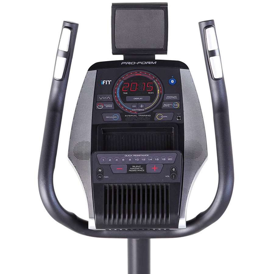 Вертикальный велотренажер для домашнего использования. Включает в себя 20 программ тренировок, 20 уровней электромагнитного сопротивления. Плавный ход маховика, удобное сиденье и эргономичные педали с фиксирующими ремешками позволяют двигаться как на обычном велосипеде. Встроенные в ручки тренажера датчики пульса EKG™ Grip Pulse помогут Вам контролировать частоту сердечных сокращений на протяжении тренировки. А вмонтированный в консоль двухскоростной вентилятор CoolAire™ сохраняет комфортную прохладу во время занятий. LED-дисплей, с круглым, интуитивным интерфейсом и поддержкой технологии iFit®, дает возможность сохранять и отслеживать результаты тренировок. Держатель для планшета, два встроенных динамика и порт для подключения iPod®.