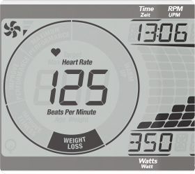 Показания консоли  профиль, круговой индикатор целей, время, дистанция, скорость, калории, обороты в мин., уровни, пульс, Ватты